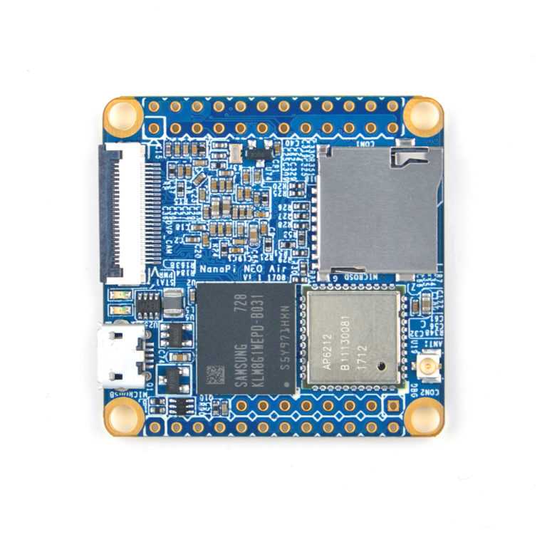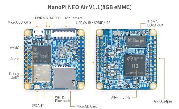 NanoPi NEO Air — одноплатный компьютер с SoC Allwinner H3, разработанная и выпущенная компанией FriendlyARM, модификация NanoPi NEO путем замены порта Ethernet на WiFi: 802.11b/g/n c Bluetooth: 4.0. А USB порт сменили входом DVP-камеры: с 24-контактным гнездом FPC. Размер всего 40 x 40 мм. Оперативной памяти 512 Мб. Работает с Ubuntu, Debian и т. д.