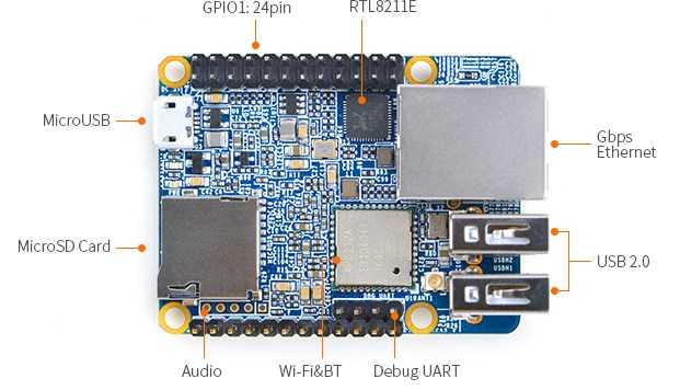 | GPIO | GPIO1: 2,54 мм шаг 24-штырькового разъема, совместимый с выводом GPIO от Raspberry Pi1. Он включает в себя UART, SPI, I2C, IO и т.д. GPIO2: 2,54 мм шаг 12-штырьковый разъем. Он включает в себя USB, ИК-приемник, I2S, IO и т.д. |
