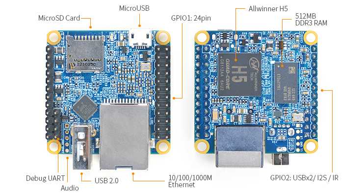 Питание подается через порт MicroUSB DC 5V/2A. Встроенный последовательный порт отладки и 24-контактный GPIO. Купить можно на Aliexpress. Для хранения данных служит сменная карта microSD. Имеются платы расширения с дополнительными разъёмами.