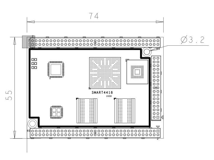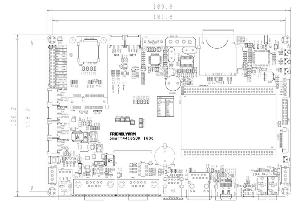 Плата процессора Smart4418 имеет 2 мм штыревые разъемы (P1, P2 и P4), содержащие 174 контакта. По умолчанию P1 и P2 спаянные с платой, а P4 свободны для использования. Работает с различными ЖК-дисплеями FriendlyARM 3.5“, 4.3“, 5“, 7“, 10.1“ LCD.