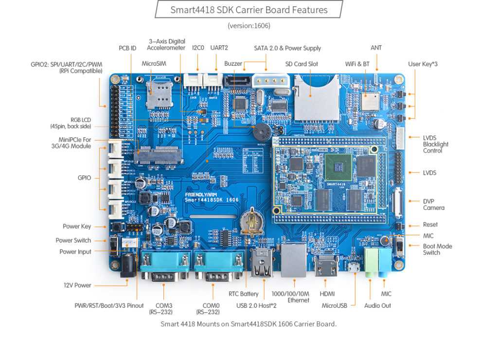 Платформа Smart4418 SDK V1606 имеет различные интерфейсы и порты: HDMI, USB-хост, слот для SD-карт, последовательный порт SB9, порт Ethernet RJ-45, аудиоразъем 3,5 мм, интерфейс SATA, MiniPCIe, MicroSIM с поддержкой 3G/4G, Bluetooth и WiFi. Кроме того, у него есть аппаратные ресурсы, такие как зуммер, аккумулятор RTC, микрофон и т.д. Купить можно на Aliexpress.
