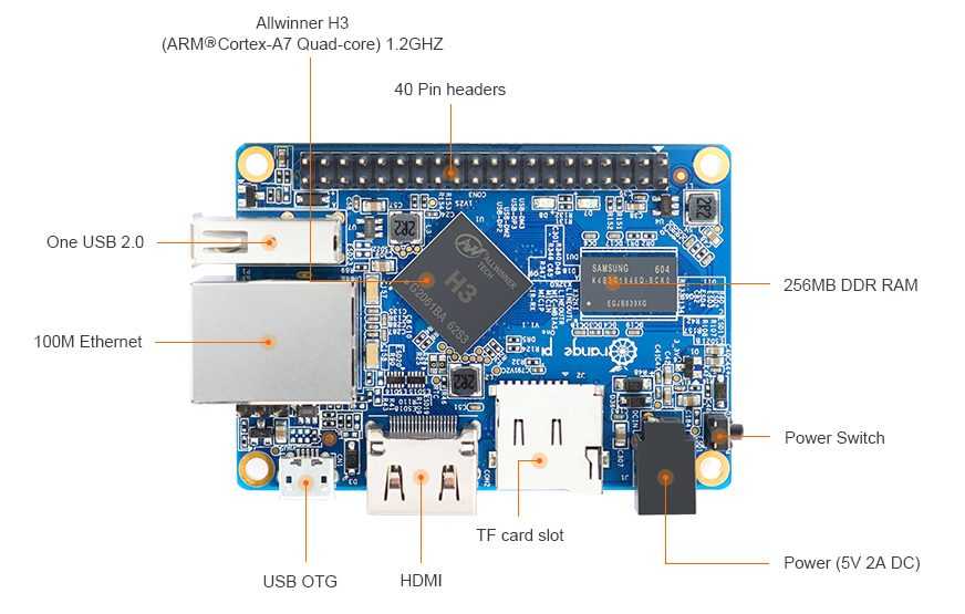 Orange Pi One — один из самых популярных, одноплатный четырехъядерный микрокомпьютер с процессором ARM Cortex-A7 (1,2 ГГц) H3 и двухъядерным видео Mali 400MP2 (600 МГц). Цена от производителя на Aliexpress около 10$. Оперативной памяти доступно 512 МБ DDR3. Для хранения данных и операционной системы служит сменная карта microSD. Есть порт Ethernet (100 Мбит/с), один полноразмерный порт USB 2.0 и один mini-USB с поддержкой OTG. Питание платы через USB-OTG не поддерживается. Можно подключить монитор или телевизор через HDMI, а через CSI разъем камеру. Orange Pi One как и вся серия Orange Pi имеет гребёнку GPIO 40 контактов.