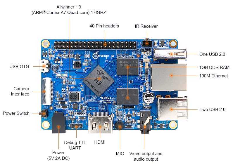 Orange Pi PC — одноплатный самый сбалансированный четырех-ядерный микрокомпьютер для различных проектов с процессором Allwinner H3 с ядрами Cortex-A7 (1,2 ГГц) и двух-ядерным видео Mali 400MP2 (600 МГц). Реальная замена настольного ПК, комфортный веб-серфинг и просмотр видео H.265/HEVC 4K. Цена от производителя на Aliexpress около 15$. Оперативной памяти доступно 1Гб DDR3. Для хранения данных и операционной системы служит сменная карта microSD. Выход в сеть через LAN 10/100 Mб/с, три полноразмерных порта USB 2.0 и один mini-USB с поддержкой OTG. Питание платы через USB-OTG не поддерживается. Естественно имеется ИК-приемник и микрофон, контактная площадка UART. Можно подключить монитор или телевизор через HDMI, а через CSI разъем камеру. Orange Pi PC имеет гребёнку GPIO (40 контактов). Orange Pi PC поддерживает множество операционных систем: Android, OpenELEC, Ubuntu, Debian,Armbian, Raspbian, Lubuntu, RetrOrangePi и др.