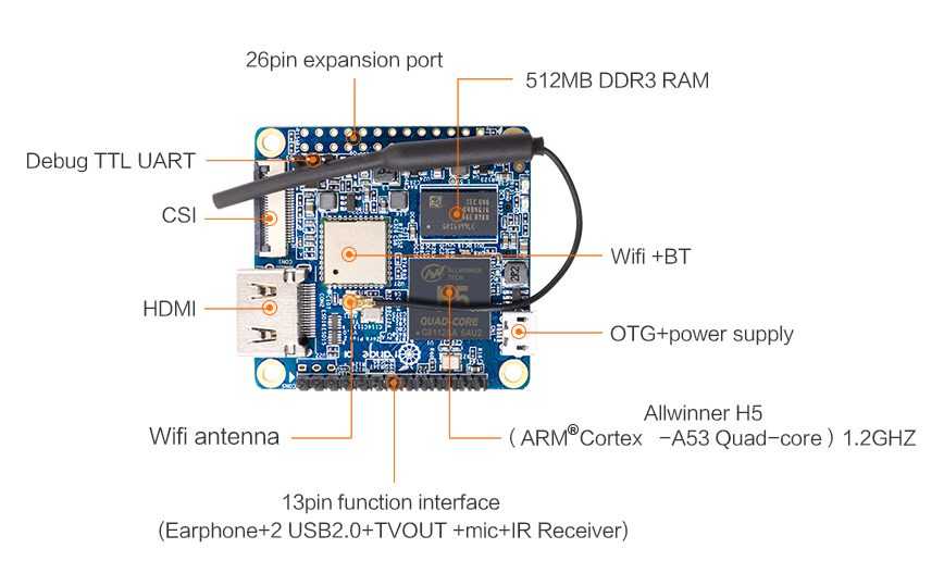 Orange Pi Zero Plus 2 H5 — Усовершенствованный Orange Pi Zero H3 путем установки в него процессора Allwinner H5 вместо H3. На борту HDMI и разъёмом CSI (Camera Serial Interface — последовательный интерфейс камеры), который имеет достаточную скорость для передачи видеоданных в форматах до 1080p при 30 кадрах в секунду или 720p при 60 к/сек, обновился модуль Wi-Fi, теперь он стал с bluetooth, а также добавили флэш-модуль eMMC 8 Gb. Цена от производителя на Aliexpress около 20$. Изделие имеет размеры всего 48 × 46 мм и весит 20 граммов. Применён четырехьядерный процессор Allwinner H3, на основе ядра Cortex-A7 с тактовой частотой до 1,2 ГГц. Видеоподсистема на двухъядерном Mali-400MP2 с частотой 600 МГц. На борту с 512 Мб оперативной памяти. Для хранения данных служит сменная карта microSD. Имеются расширяющие платы с дополнительными разъёмами.